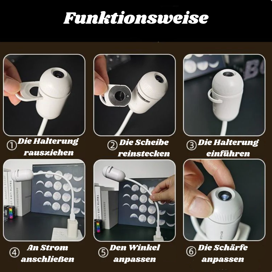 In nur wenigen Sekunden werden schlichte Decken zu einer beruhigenden Galaxie. Unsere Kunden sagen, dass es sowohl Kindern als auch Erwachsenen hilft, schneller einzuschlafen - ganz ohne Bildschirme, Tabletten oder Lärm.